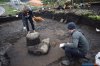 Посреди одного из раскопов стоит некая инсталляция из нескольких камней. Один из них, тот, что повыше, напоминает причальный кнехт, второй камень лежит рядом, поверх камней были найдены фрагменты керамической посуды.