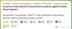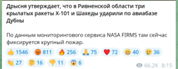Ночь на хуторе вышла насыщенной много где, но на первое место с большим отрывом выходит Дубно, вернее, военный аэродром под ним. Счет прилетам по меньшей мере идет на многие десятки, в несколько волн, и помимо "Гераней" и крылатых ракет разносится визг о применении даже "Кинжалов", причем неоднократном.